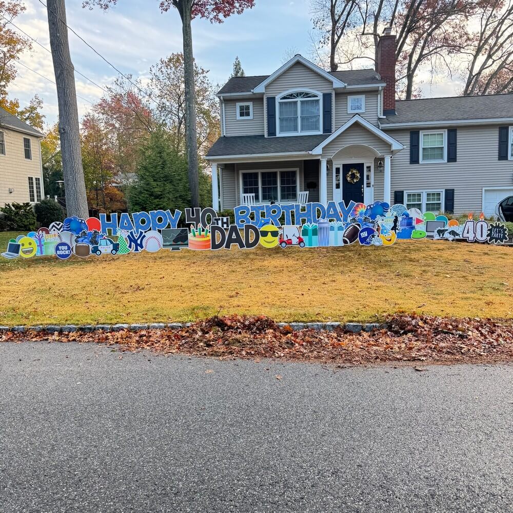 LOL Yards created an unforgettable personalized 40th birthday yard card display for a beloved dad in Oakland, NJ, turning his front lawn into a stunning tribute to his milestone day. This custom yard card setup featured bold “Happy 40th Birthday” lettering with his name proudly displayed in sleek black and blue lettering, and heartfelt touches tailored just for him—delivering a jaw-dropping, one-of-a-kind surprise the moment he stepped outside. Neighbors stopped to admire the gorgeous, professionally arranged birthday yard card that made his 40th celebration truly special and picture-perfect.